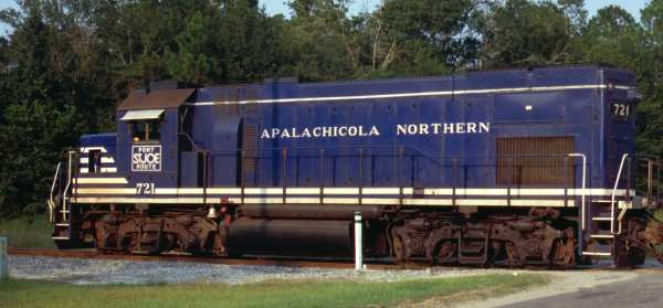 EMD GP15T and GP15-1 Telogia, Fl; August 1999. GP15T 721 is only one of 3 owned by Apalachicola Northern and of only