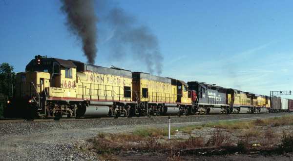 Dayton, TX; September 1999. Dayton, TX; September 1999. UP 1686 and 1623 are in the lead of a local.